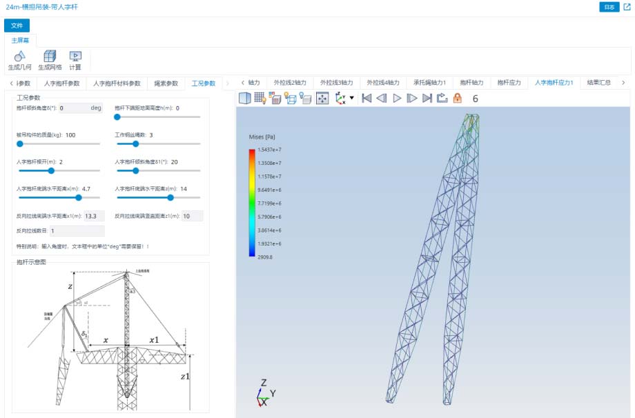 - 可實現抱桿的快速建模,對抱桿截面、等邊角鋼截面、抱桿材料、繩索參數以及工況條件進行參數化建模計算;通過豐富的可視化后處理技術,對抱桿的受力情況進行精準可靠的分析。
